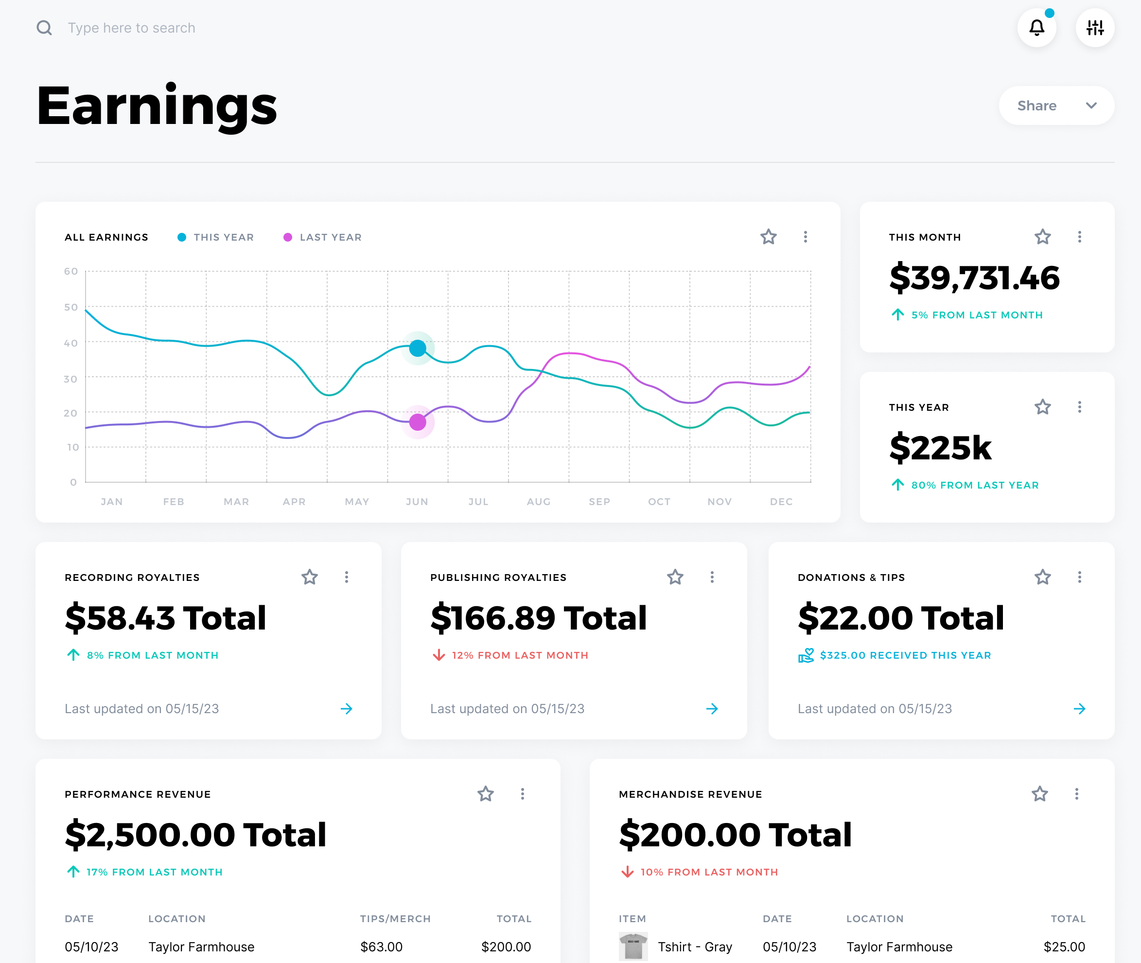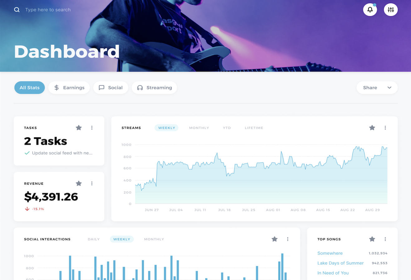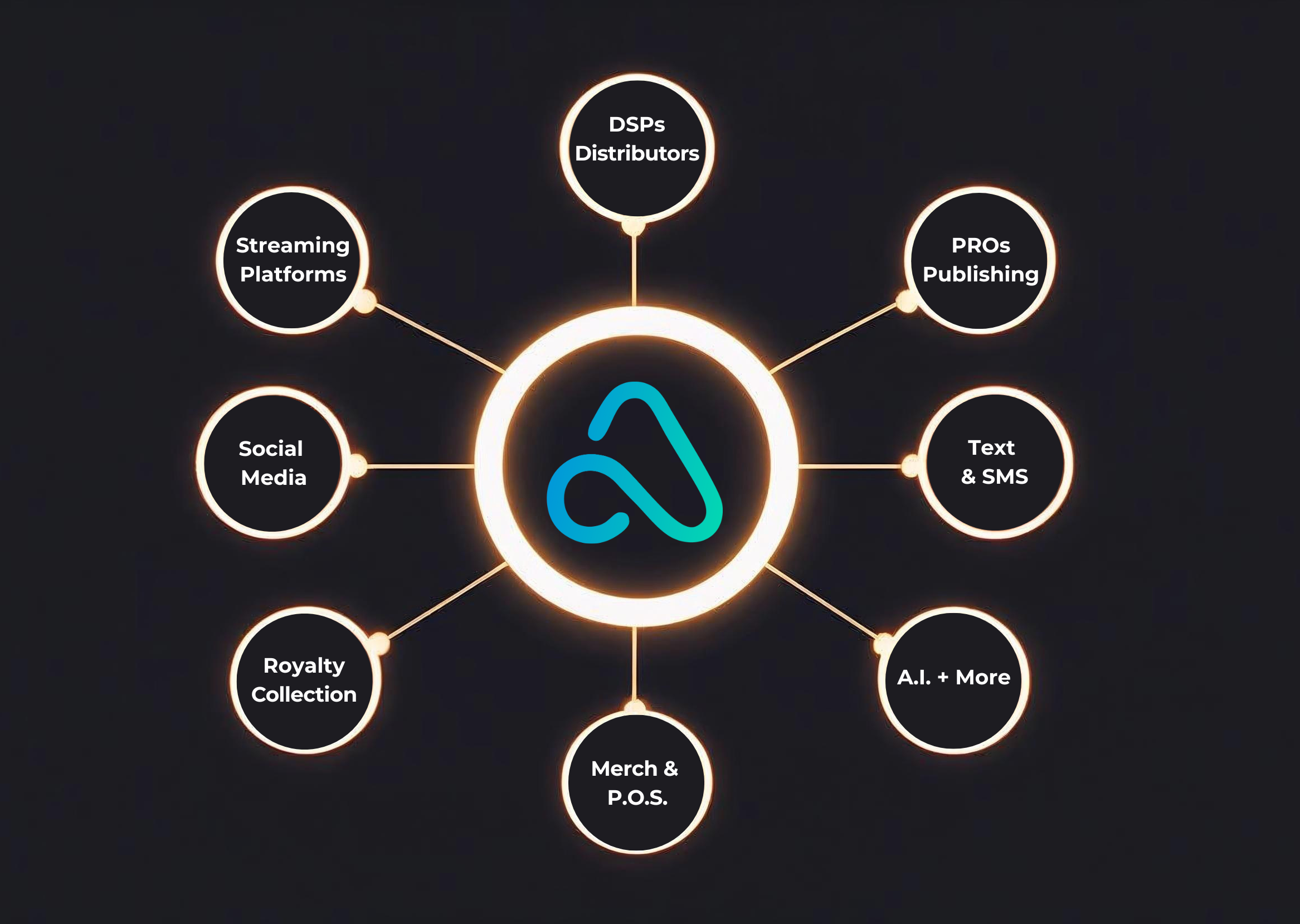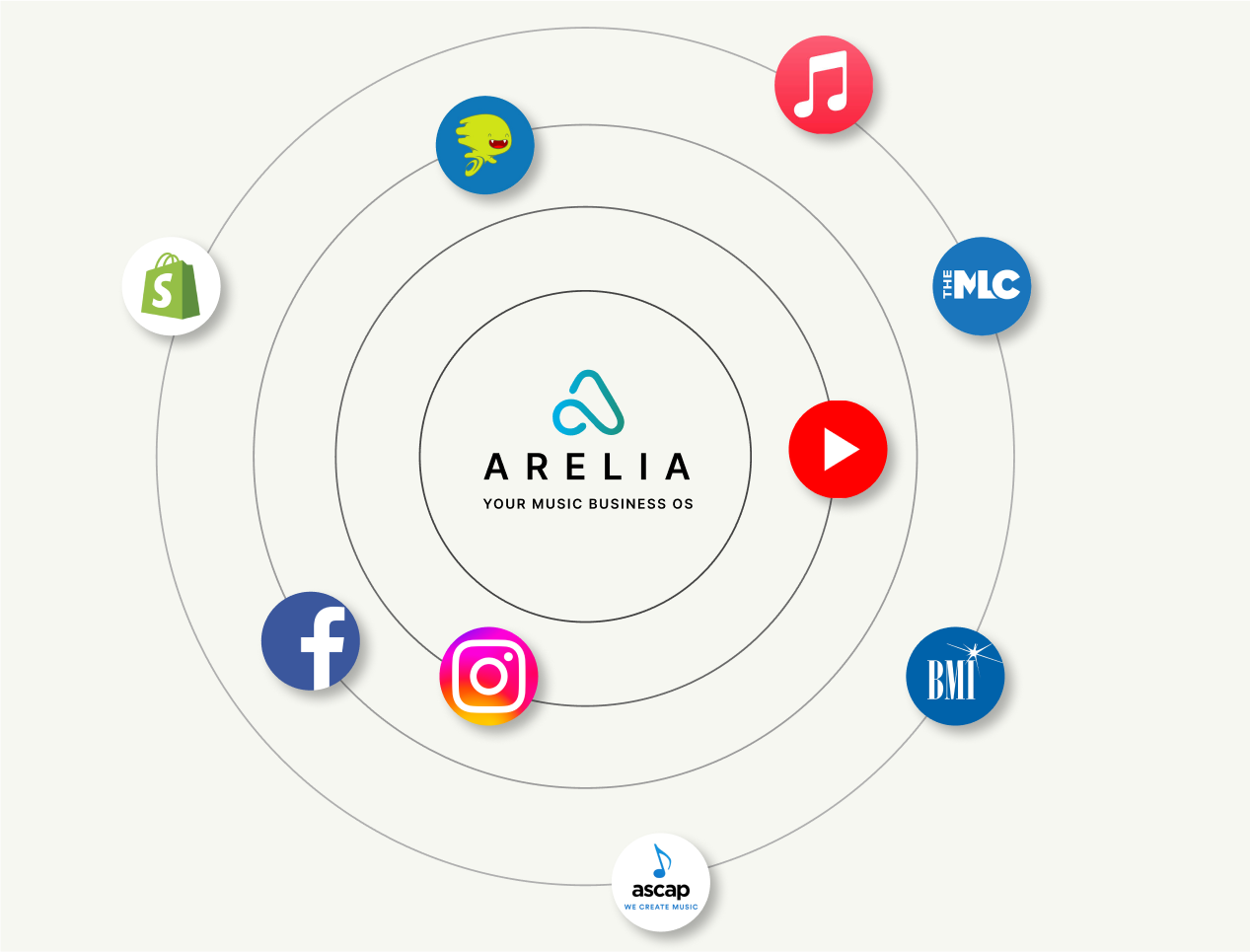 ARELIA syncs with top industry platforms—distributors, PROs, merch, socials, and more—so your data is always live, in one real-time dashboard.